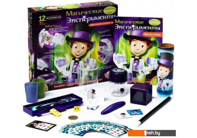 | Информация | Больше всего на свете дети любят фокусы. Но одно дело просто смотреть на них, и совсем другое самому стать волшебником! Научно-развлекательный набор Магические эксперименты для детей старше 7 лет поможет любому ребенку почувствовать себя настоящим Копперфильдом! В красочно иллюстрированной инструкции подробно объясняется, как провести 12 увлекательнейших экспериментов Ваш маленький волшебник сможет притягивать предметы, прятать их или придавать им необычную форму. |