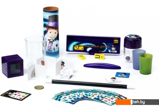 | Состав набора | В состав набора входят контейнер с крышкой, два цветных шарика, коробка под домино, 6 костяшек домино, волшебная палочка, вертушка, маленькие карты с картинками, кристальный кубик, прозрачный стакан, бумажная салфетка, картонный цилиндр, магический плакат, шарики, карты с картинками, цветные стаканы, монетка, коробочка с прозрачным стеклышком, красочная инструкция. |