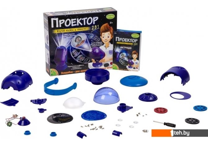 | Информация | Ребёнок увлекается космосом или хочет стать космонавтом? Порадуйте малыша набором Проектор 2 в 1. Следуя подробной инструкции, ребёнок самостоятельно познакомится с принципами работы проектора и соберёт действующую модель. Кроме того, он узнает интересные факты из истории освоения космоса и изучит планеты, звёзды и галактики. |