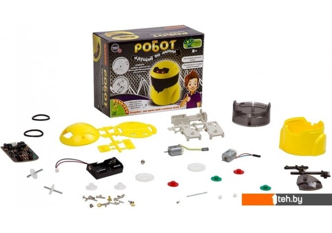 | Состав набора | В наборе все детали для сборки робота, а также светочувствительные элементы, датчики освещенности, мигающие светодиоды, батарейный модуль и конечно же подробная красочная инструкция! Дополнительно могут понадобиться крестовая отвертка, бокорезы, черный маркер, 2 батарейки АА в комплект не входят |