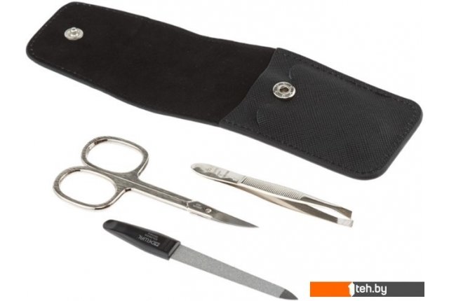 | Комплектация | • ножницы маникюрные — углеродистая сталь, никелированное покрытие, 9 см. • пилка металлическая — углеродистая сталь, хромированное покрытие, 9 см. • пинцет скошенный — нержавеющая сталь, никелированное покрытие, 8 см. |