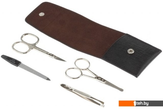 | Комплектация | • ножницы для бороды и усов — углеродистая сталь, никелированное покрытие, 9 см. • ножницы маникюрные — углеродистая сталь, никелированное покрытие, 9 см. • пилка металлическая — углеродистая сталь, хромированное покрытие, 9 см. • пинцет скошенный — нержавеющая сталь, никелированное покрытие, 8 см. |