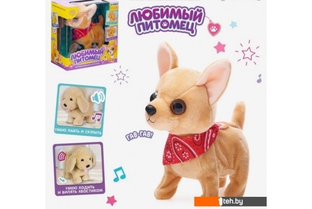 | Особенности | Щенок имеет мягкую шёрстку, умеет ходить и вилять хвостиком, лает и скулит. Игрушку можно взять с собой на прогулку, в школу или детский сад, а также поиграть дома. |