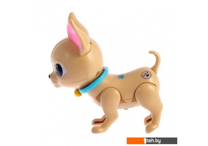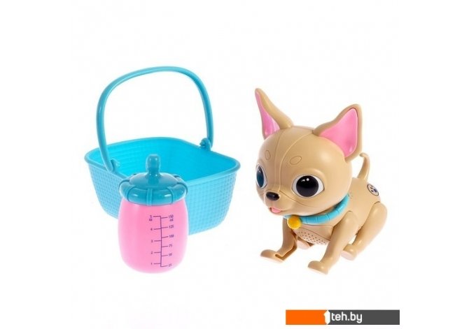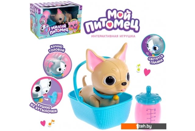 | Особенности | Питомец реагирует только на свою бутылочку. Пёсик лижет её, аппетитно причмокивая язычком. А также у него светятся глазки, и он забавно качает головой. |