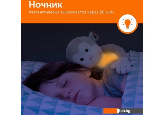 | Особенности | 3 разных мелодии. Когда малыш засыпает, может проигрывать 3 разные мелодии: колыбельные, успокаивающие мелодии и звуки природы. Автоматическое выключение. Свет и музыка автоматически выключатся через 20 минут. Датчик звука. Звук включится, если ваш малыш проснётся ночью и заплачет. Уровень громкости. Два режима громкости. |