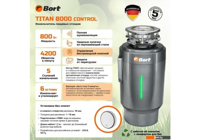 Фотографии, описание и технические характеристики модели Измельчителя пищевых отходов Bort Titan 8000 Control взяты из открытых источников, официального сайта производителя или представительства Bort в Республике Беларусь.