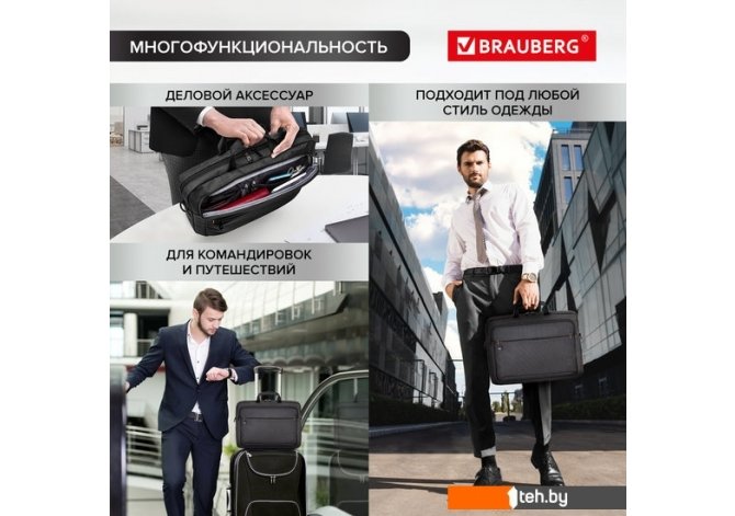| Информация | Многофункциональная сумка-портфель BRAUBERG «Pragmatic» с отделением для ноутбука с диагональю экрана до 15-16" способствует безопасной переноске электронных устройств. Оригинальный и лаконичный дизайн подчеркивает статус владельца. Сумка может использоваться как для ежедневного использования, так и для поездок в командировки или путешествия. Надежный аксессуар выполнен из прочных материалов, которые надежно защитят устройство от внешних воздействий. Внешние и внутренние карманы, вместительное отделение позволяют упорядоченно разложить множество необходимых вещей помимо ноутбука. Стенки и дно уплотнены толстым слоем специальной амортизирующей пены, что позволяет защитить электронное устройство от механических повреждений. Специальное отделение с плотными стенками надежно защитит ноутбук. Благодаря перегородке и карману в основном отделении все необходимые для электронного устройства аксессуары, такие как блок питания, мышка и прочее, можно разместить отдельно, что позволит защитить ноутбук от царапин и упорядоченно разложить необходимые предметы. Внешнее отделение с органайзером предусмотрено для документов, портмоне, пишущих принадлежностей, телефона и прочего. Документы формата А4 с легкостью поместятся в основном и внешнем отделениях. Передний наружный карман облегчит доступ к самым необходимым вещам. Деловая сумка изготовлена из современного, износостойкого и качественного материала — полиэстера, обладающего водоотталкивающими свойствами. Комбинирование разных фактур делает эту сумку не похожей на остальные. Для подкладки используется прочный, устойчивый к воздействию загрязнений полиэстер. Полиэстер обладает отличной устойчивостью цвета к солнечным лучам и легкостью в уходе. Загрязнения легко удаляются с помощью мыла и мягкой влажной губки. Регулируемый съемный плечевой ремень с мягкой накладкой и с прочной металлической фурнитурой обеспечивает удобную эксплуатацию. Багажная лента позволяет зафиксировать рюкзак на телескопической ручке чемодана для удобного перемещения нескольких предметов багажа. Прочные ручки сложены в центре, что способствует удобной переноске в руках. Сумку легко открывать и закрывать одной рукой с любой стороны — основное отделение имеет долговечную реверсивную молнию с удобными металлическими бегунками. |