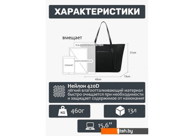 | Информация | ? Эта вместительная модель трапециевидной формы с устойчивым дном подойдет для повседневного использования — в офис, учебу, путешествия. ? Оснащена двумя длинными текстильными ручками с металлическим армированием для дополнительной прочности. ? Их можно использовать для переноски на плече или в руке. ?? Легкий влагоотталкивающий материал быстро очищается при необходимости и защищает содержимое от намокания. ? В основном отделении, которое закрывается на молнию с удобным захватом, разместятся планшет, тетради, книги, кошелек, зонт и другие нужные вещи. ? Предусмотрен отдельный карман для ноутбука. ? Также есть сетчатые кармашки и отсек на молнии для мелочей. ? Сзади расположен защищенный карман для ценностей и широкая багажная лента, чтобы закрепить сумку на ручке чемодана. ? Устойчивое дно на металлических ножках дополнительно оберегает вещи от намокания снизу. |