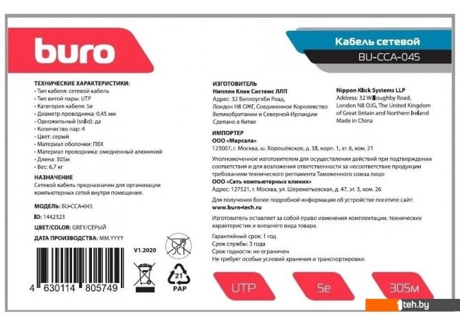 Фотографии, описание и технические характеристики модели Кабеля, адаптера, разветвителя Buro BU-CCA-045 (305 м, серый) взяты из открытых источников, официального сайта производителя или представительства Buro в Республике Беларусь.