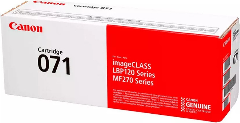 Информация | - Оригинальный тонерный картридж Canon 071 5645C002 заполнен черным сферическим тонером. - Разрешение печати до 1200?1200 точек на дюйм обеспечивает высокое качество печати текста и графики с высокой детализацией. - При установке картриджа следует соблюдать инструкции по распаковке и установке в принтер или МФУ. - Не следует касаться руками и посторонними предметами к поверхности чипа и фотобарабану картриджа. |