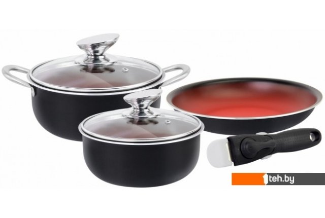 | Состав набора | кастрюля 24 см, 5 л с крышкой сковорода 24 см, 1.8 л ковш 18 см, 2 л с крышкой со съемной ручкой |