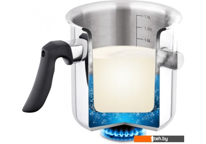 | Информация | Молочник предназначен не только для кипячения молока, но и для приготовления каши, кремов и соусов, растапливания шоколада для кулинарных изделий.Молочник изготовлен из первоклассной нержавеющей стали и имеет прочное двухслойное днище с терморегуляционными характеристиками для быстрого развода тепла и экономии энергии. Металлический корпус молочника имеет двойные стенки из высококачественной нержавеющей стали (между которыми заливается 200 мл воды, которая с температурой кипения 100°C не позволяет подгорать продуктам), съёмный свисток и soft ручку из термостойкого пластика и индикатор уровня воды на внутренней стенке. |