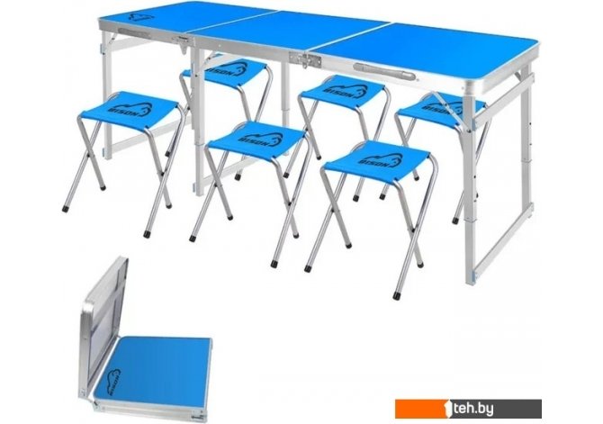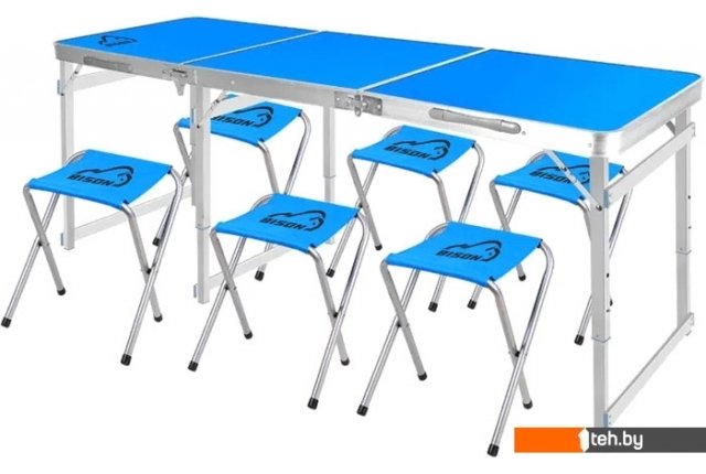 Информация | ? Стол для пикника Bison С-6-60x180 (синий) с удобными складными стульями - идеальное решение для отдыха на природе. Изготовлен из алюминиевого сплава, выдерживает нагрузку до 50 кг на стол и до 100 кг на каждый стул. ? Стол и стулья быстро складываются в компактный кейс весом 10.5 кг, что делает их легкими для транспортировки. ? Размер стола в сложенном состоянии - 60х60х15.5 см, а за столом может комфортно разместиться до 8 человек. ? Стулья компактно убираются внутрь стола, который складывается в форму чемодана и фиксируется застежкой. ? Высота стола регулируется в 3-х режимах (55 см, 60 см и 70 см) и фиксируется с помощью кнопки. ? Столешница из МДФ с покрытием меламин, обладающим водоотталкивающими свойствами и легко моющимся. ? Для устойчивого положения стола, ломберные петли на ножках фиксируются нажатием до упора, а поперечины на ножках предотвращают "разъезжание" и "закапывание" ножек стола. |