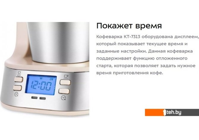 | Информация | ? Капельная кофеварка KT-7313 готовит ароматный чёрный кофе из молотого кофе одним нажатием кнопки. Лёгкая и компактная, идеально подходит для маленьких кухонь. ? Многоразовый фильтр вмещает 15 грамм молотого кофе и позволяет заваривать кофе неограниченное количество раз. Резервуар для воды имеет специальные отметки 240, 300 и 420 мл для удобного наливания воды. ? Дисплей показывает текущее время и заданные настройки. Функция отложенного старта позволяет задать нужное время приготовления кофе. ? Термокружка из пластика и нержавеющей стали с силиконовой вставкой сохранит тепло вашего кофе и станет незаменимой в поездках и повседневной жизни. ? Прорезиненные ножки предотвращают скольжение по столу. Подходит для приготовления кофе дома или в офисе. ?? Вам больше не придётся вставать утром пораньше, чтобы успеть приготовить себе свежий кофе. |