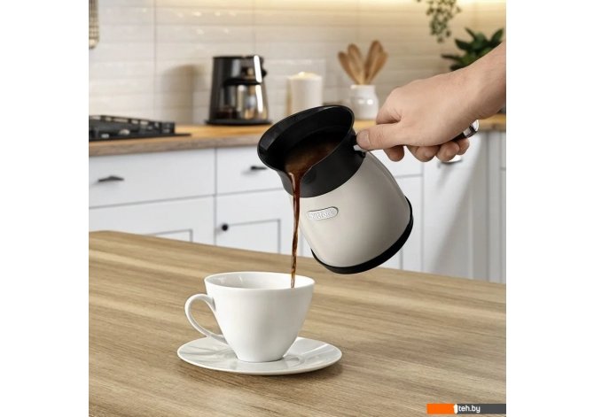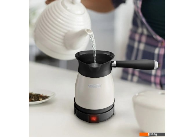 | Информация | - Кофе по-турецки за 5 минут Электрическая турка КТ-7501 варит кофе по-турецки. С ней вы сможете быстро и легко сварить натуральный кофе на 7 чашек по 50 мл. Устройство состоит из базы и турки. - Всё просто! Кофе по-восточному или кофе по-турецки — кофе, приготовленный путем варки мелкомолотых зерен кофе в воде. Чтобы сварить кофе по-турецки, в турку засыпают молотый кофе, заливают воду и нагревают её почти до кипения. - Управление 1 кнопкой Кнопка «Вкл/Выкл» включает и выключает турку. После включения турка будет работать в течение 3 часов в режиме поддержания температуры. У турки есть световой индикатор, который горит во время работы турки. - Удобно хранить Ручка турки пластиковая. Она не нагревается и удобно лежит в руке. Ручка съёмная, поэтому турку удобно хранить. Рекомендуется очищать турку сразу после каждого приготовления. - Носик для удобного наливания Турка КТ-7501 оснащена удобным носиком для точного наливания кофе в чашку, так ваша кухня останется чистой – кофе попадёт только в чашку! Дно турки изготовлено из высококачественной нержавеющей стали, так что за прибором легко ухаживать. - |