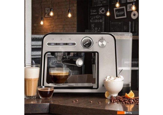 | Информация | - Кофе с молочной пенкой! Кофеварка КТ-7515 идеально подходит для приготовления эспрессо, капучино, латте и других кофейных напитков по вашему вкусу. С помощью стимера вы сможете создать воздушную молочную пенку или подогреть паром чай и молоко. - Простое управление Управление кофеваркой осуществляется с помощью нескольких кнопок: «Вкл/Выкл» для включения и отключения нагрева, «Эспрессо» для одной порции и «Двойной эспрессо» для двух порций. - Стимер для молочной пенки Создайте молочную пенку для капучино самостоятельно! Стимер, который подает пар и горячую воду, позволяет легко взбить молоко. Насадка панарелло делает процесс ещё проще. - Манометр и переключатель Переключатель управляет подачей горячей воды или пара, а манометр помогает контролировать давление в бойлере, необходимое для подачи воды в рожок. - Съёмный резервуар для воды Резервуар ёмкостью 1 литр легко снимается для наполнения. Крышка также просто открывается, что позволяет заливать воду, не снимая резервуар. - Платформа для подогрева Платформа для подогрева работает от бойлера и предназначена для прогрева рожка, фильтров и чашек. Часть платформы, удалённая от бойлера, будет слегка тёплой. - Выбор гурманов Рожковая кофеварка – идеальный выбор для тех, кто хочет наслаждаться богатым вкусом свежезаваренного кофе. Технология приготовления сохраняет полезные вещества и аромат напитка. - Полный комплект Кофеварка комплектуется металлическим рожком, который отлично прогревает напиток, делая его насыщенным и с хорошей пенкой. Мерная ложка-темпер поможет правильно заполнить рожок и утрамбовать кофейную таблетку. |