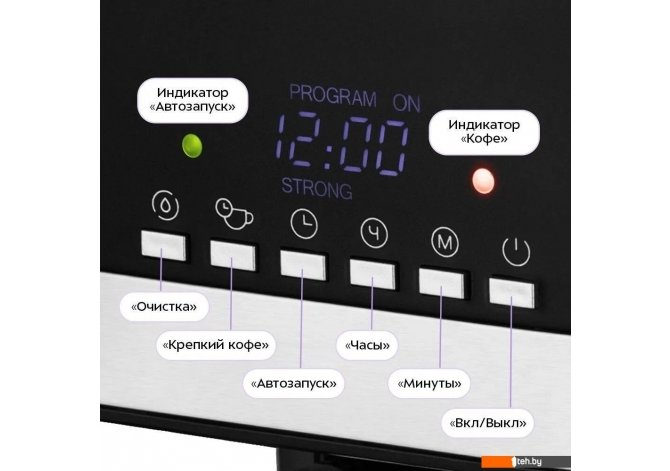 | Информация | - Капельная кофеварка КТ-7627 позволяет наслаждаться ароматным чёрным кофе, приготовленным из молотого кофе. Управление устройством интуитивно понятное благодаря удобной панели. Компактные размеры кофеварки не займут много места на вашей кухне. - Резервуар для воды вмещает 1,8 литра и оснащён мерной шкалой для удобства использования. В процессе приготовления вода нагревается в резервуаре и подаётся в многоразовый фильтр с молотым кофе. После фильтрации кофе попадает в кофейник. - Управление осуществляется с помощью кнопок, а на дисплее отображается выбранное действие, текущее время или время подогрева. Вы можете запустить процесс приготовления кофе немедленно или установить отложенный старт, а также настроить время и активировать функцию очистки от накипи. - В комплекте с кофеваркой КТ-7627 идёт стеклянный кофейник ёмкостью 1,8 литра, что позволяет вам всегда видеть, сколько кофе осталось. |