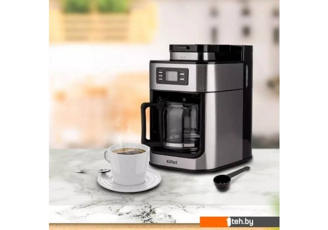 | Информация | Свежемолотый и ароматный! Капельная кофемашина Кіtfort КТ-781 готовит ароматный кофе одним нажатием кнопки. Встроенная кофемолка автоматически измельчит кофейные зерна сразу в фильтре. Кофемашина предназначена для приготовления кофе в домашних условиях или в офисе. Измельчит и сварит кофе! Всё просто: вода в кофемашине доводится до температуры 80-90 °С, после чего медленно поступает в фильтр с молотым кофе и в кофейник. Для кофемашины КТ-781 вы можете использовать и молотый, и зерновой кофе, так как модуль кофемолки съёмный. Горячий кофе к завтраку! Благодаря LED-дисплею управление кофеваркой простое и понятное. Функция автозапуска позволит начать приготовление кофе в заданное время, чтобы приготовить для вас горячий кофе к завтраку. Кроме того, на дисплее отображается текущее время. Функция автоподогрева Платформа с подогревом, на которой стоит кофейник, будет горячей в течение 30 минут. Затем кофемашина выключится, оповещая звуковым сигналом. Кофемашина оборудована противокапельной системой-затвором, вы можете налить кофе в чашку в любой момент! Кофе хватит на всех! Резервуар для воды емкостью 1 л позволяет за один раз приготовить кофе на 5 больших или 10 маленьких чашек. Корпус кофейника прозрачный, поэтому вы всегда можете видеть, сколько кофе еще осталось. В комплекте идёт мерная ложка для молотого кофе. |