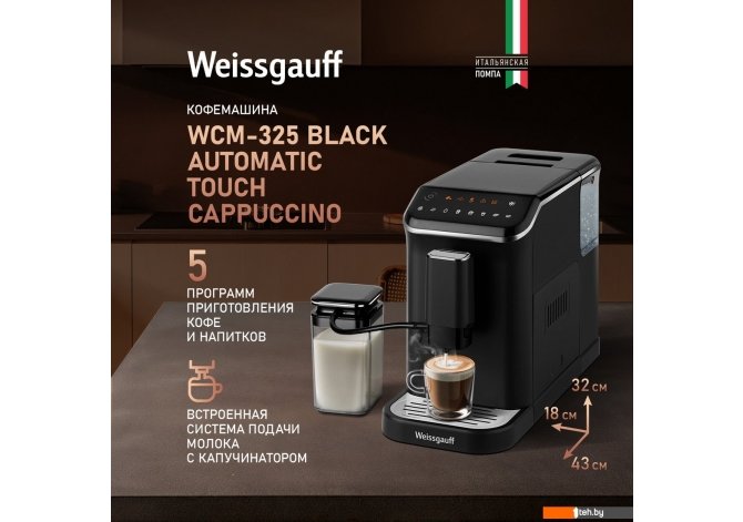Фотографии, описание и технические характеристики модели кофеварки Weissgauff WCM-325 Black Automatic Touch Cappuccino взяты из открытых источников, официального сайта производителя или представительства Weissgauff в Республике Беларусь.