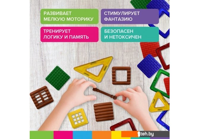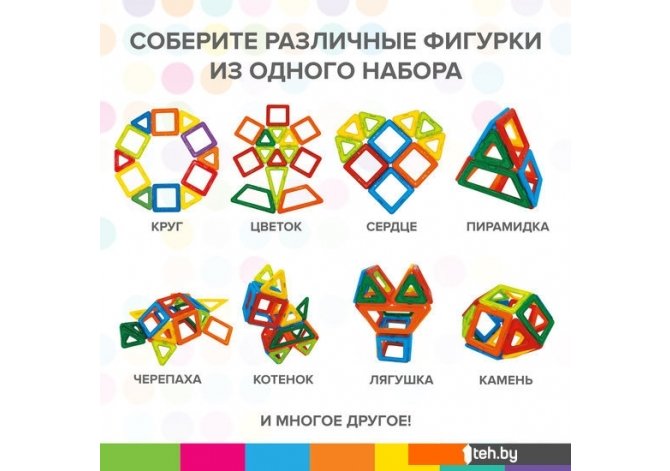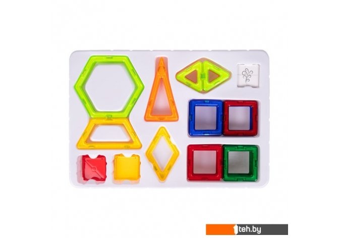 | Информация | В набор входит 42 элемента: 15 магнитных элементов в форме квадрата, 9 магнитных элементов в форме треугольника, 2 магнитных элемента в форме удлиненного треугольника, 2 магнитных элемента в форме шестиугольника, 2 магнитных элемента в форме трапеции, 1 магнитный элемент в форме ромба, 10 специальных пластиковых вставок под обучающие карточки, а также комплект из 16 двусторонних обучающих карточек с цифрами, математическими символами, фруктами, ягодами, явлениями природы. Инструкция по сборке возможных фигур прилагается. Яркие детали и обучающие карточки заинтересуют детей, побуждая их к созданию множества новых конструкций и идей. Магнитный конструктор подходит для развития пространственного мышления, изучения чисел и геометрических фигур, развития фантазии и воображения, формирования навыков конструирования. |