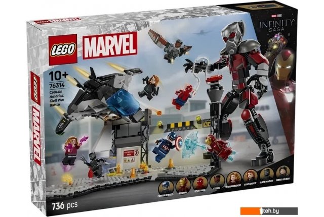 | Информация | - «Капитан Америка: Битва во время гражданской войны» — это детализированная сборная игрушка LEGO® Marvel, которая станет эпическим подарком супергероя для детей в возрасте от 10 лет и старше. Этот сборный набор LEGO с 9 фигурками LEGO Marvel, самолетом Quinjet и множеством аксессуаров позволяет детям воссоздать любимые моменты из фильмов и исследовать бесконечные творческие приключения и продемонстрировать свои собственные возможности. - Этот сборный игровой набор основан на сцене боя в аэропорту из фильма Marvel Studios «Первый мститель: Гражданская война». Он включает в себя 8 минифигурок — Капитана Америку, Зимнего солдата, Ванду, Сокола, Железного человека, Человека-паука, Черную вдову и Черную пантеру — с оружием и аксессуарами, а также полностью суставного Человека-муравья высотой более 9,5 дюймов. Самолет Quinjet имеет складные крылья и открывающуюся кабину, в которой сидит минифигурный пилот. Боевому действию еще больше способствует функция взрывающейся бочки, встроенная в декорации аэропорта. Дети могут увеличивать и вращать модели во время сборки с помощью цифрового приложения LEGO Builder. - Captain America: Civil War Action Battle – эта сборная игрушка Marvel для детей оживляет сцену битвы в аэропорту из фильма Marvel в эпическом масштабе для мальчиков и девочек в возрасте от 10 лет и старше. - Фигурки LEGO® Marvel — включают в себя большую, полностью сочлененную фигурку Человека-муравья LEGO и 8 минифигурок: Капитана Америку, Зимнего солдата, Ванду, Сокола, Железного человека, Человека-паука, Черную вдову и Черную пантеру. - Игровой набор «Капитан Америка» — дети воссоздают любимые моменты из фильмов и исследуют бесконечные творческие приключения. - Приключенческий набор LEGO® «Супергерой» — взрывающаяся бочка и самолет Quinjet со складными крыльями и открывающейся кабиной расширяют творческие возможности для игр и демонстрации. - Подарок LEGO® Marvel для детей — этот универсальный сборный игровой набор является подарком для поклонников супергеройских боевиков, особенно фильма Marvel Studios «Капитан Америка: Гражданская война». - Инструкции по сборке в 3D — дети могут загрузить приложение LEGO® Builder для захватывающего процесса сборки с цифровыми инструментами для увеличения и поворота моделей в 3D, сохранения наборов и отслеживания прогресса. - Сборные игрушки для юных супергероев — широкий ассортимент наборов LEGO® Marvel открывает перед детьми постоянно меняющуюся вселенную приключений супергероев. - Приключенческий набор из 736 деталей — LEGO® Marvel Quinjet имеет размеры более 6,5 дюймов в ширину, а высота сборной фигурки LEGO Человека-муравья составляет более 9,5 дюймов. |