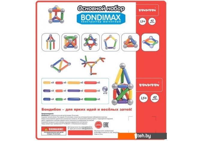 | Информация | ? Соберите объемные фигуры из крупных, легких, разноцветных деталей с помощью магнитного конструктора Bondimax! ? Фантазируйте и создавайте геометрические фигуры, фигурки животных и многое другое с помощью этого конструктора. ? Палочки притягиваются друг к другу и отталкиваются, демонстрируя принцип действия магнитов. ? Конструктор поможет выучить основные цвета, разовьет интерес к конструированию, моделированию, мелкую моторику и пространственное мышление. ? Детали набора можно мыть и дезинфицировать. ?? В основном наборе 42 детали, включая 12 длинных и 18 коротких элементов основных цветов, а также 12 шариков. |