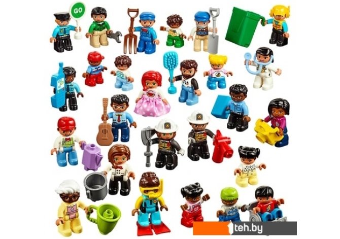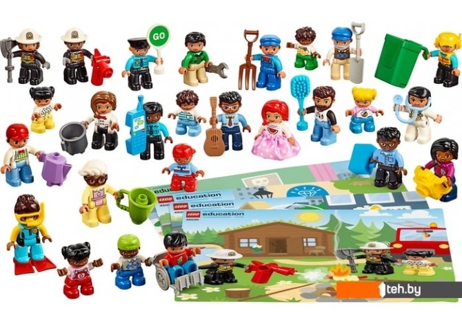 | Информация | В набор входит 44 элемента, в том числе 26 мини-фигурок LEGO DUPLO® самых разных людей: от членов семьи (ребёнка, родителей, дедушки и бабушки) до людей разных профессий (доктора, полицейского, шеф-повара и учителя).Различные аксессуары, такие как камера, расчёска, гитара, чемодан и инвалидное кресло, призваны вдохновлять детей на ролевые игры и обсуждение взаимоотношений между людьми разного пола и возраста, а также различий между ними.Для того чтобы помочь педагогам сделать занятия максимально эффективными, в набор также включена карточка «Первые шаги» с пятью идеями стартовых заданий для ознакомления с возможностями набора. |