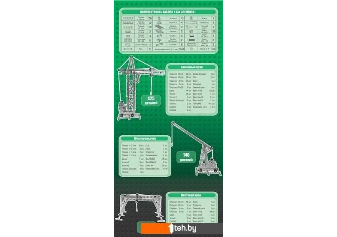 | Информация | Большой детский конструктор металлический "Краны". С помощью этого конструктора маленький инженер может собрать достаточно сложные модели крана. Данная игрушка поможет раскрыть творческие способности вашего ребенка, конструктивное мышление и смекалку. В наборе вы найдете 434 элемента, из которых собираются 3 модели. Желаем вам творческих успехов и полезного времяпрепровождения. |