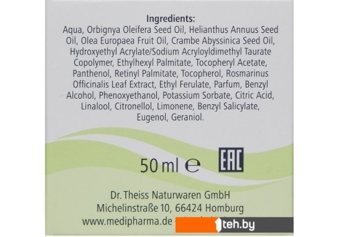 | Состав | Aqua, Orbignya Oleifera Seed Oil, Olea Europaea Fruit Oil, Crambe Abyssinica Seed Oil, Hydroxyethyl Acrylate/Sodium Acryloyldimethyl Taurate Copolymer, Ethylhexyl Palmitate, Helianthus Annuus Seed Oil, Tocopheryl Acetate, Panthenol, Retinyl Palmitate, Tocopherol, Rosmarinus Officinalis Leaf Extract, Disodium Uridine Phosphate, Parfum, Ethyl Ferulate, Polyglyceryl-5 Trioleate, Benzyl Alcohol, Phenoxyethanol, Potassium Sorbate, Citric Acid, Butylphenyl Methylpropional, Linalool, Citronellol, Limonene, Benzyl Salicylate, Eugenol, Geraniol |