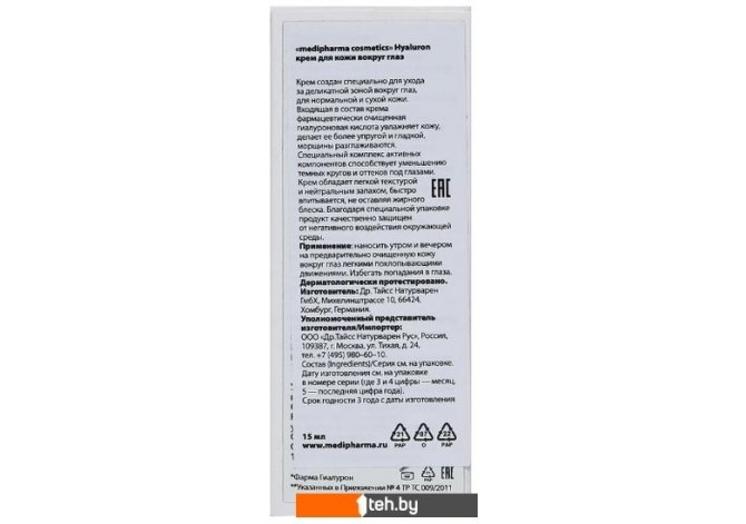 Фотографии, описание и технические характеристики модели Medipharma cosmetics Крем для век Hyaluron (15 мл) взяты из открытых источников, официального сайта производителя или представительства Medipharma cosmetics в Республике Беларусь.