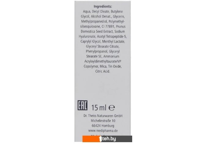| Состав | Aqua, Decyl Oleate, Butylene Glycol, Alcohol Denat., Glycerin, Methylpropanediol, Polymethyl silsesquioxane, Titanium Dioxide, Prunus Domestica Seed Extract, Sodium Hyaluronate, Acetyl Tetrapeptide-5, Caprylyl Glycol, Menthyl Lactate, Glyceryl Stearate Citrate, Phenylpropanol, Glyceryl Stearate SE, Ammonium Acryloyldimethyltaurate/VP Copolymer, Mica, Tin Oxide, Citric Acid |