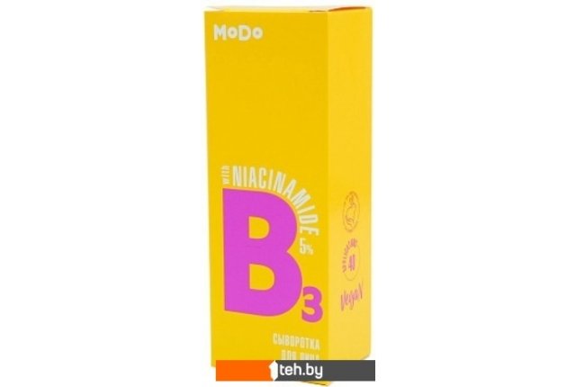 | Информация | Встречайте Хедлайнера из мира витаминов — витамин В3, он же ниацинамид, он же витамин молодости. В3 предотвращает потерю влаги, стимулируя синтез церамидов. Регулирует выработку себума и уменьшает поры. Поддерживает здоровый микробиом кожи. Сокращает появление морщин за счет стимулирования выработки коллагена. Уменьшает пигментацию кожи. Защищает от токсинов и загрязнений. Проникая глубоко в кожу, сыворотка MODO с витамином В3 придаст Вашей коже более здоровый внешний вид. |