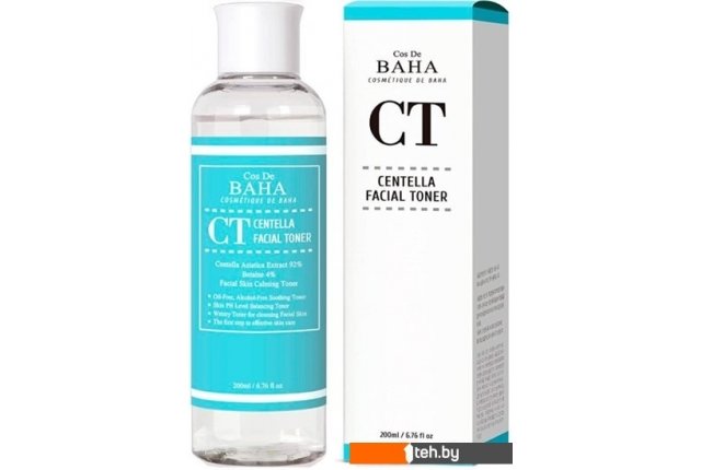 | Информация | Восстанавливающий тоник с 92% центеллы Cos De Baha CT Centella Facial Toner успокаивает, увлажняет, смягчает и нормализует кислотно-щелочной баланс. Уменьшает следы от акне, не вызывает раздражения, подходит для всех типов кожи, в том числе для чувствительной. Содержит экстракт зеленого чая, бузины и момордики харанции, без парабенов, сульфатов, спирта, отдушек и минеральных масел. |