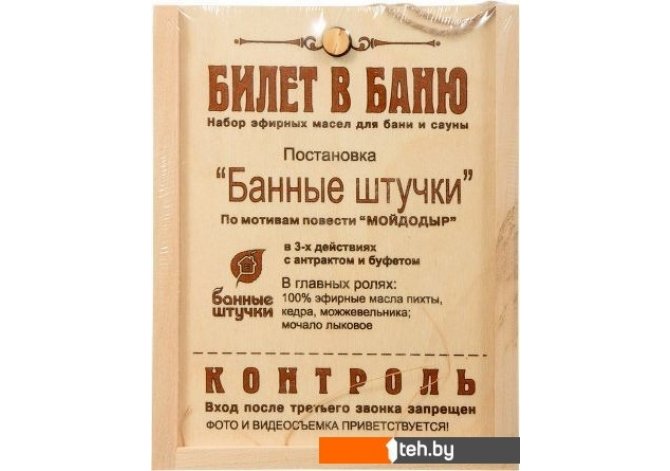 | Информация | Набор эфирных масел "Билет в баню" - это оригинальный подарок который включает в себя три вида эфирных масел (пихта, кедр, и можжевельник), а также мочало лыковое. Деревянная коробочка с оригинальной надписью будет интересным и практичным подарком для тех кто любит баню. Применение. 1. В бане или сауне использовать 6 капель на период одного сеанса. 2. В ванну добавлять 5-7 капель. |
