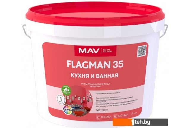 | Информация | Защита от плесени и грибка. Высокопрочная и эластичная. Для помещений с повышенной и нормальной влажностью. Износостойкая, устойчивая к частой влажной уборке. Для минеральных и деревянных поверхностей. Свойства моющейся интерьерной краски FLAGMAN 35: Образует гладкое, ровное, матовое/полуглянцевое покрытие. Водно-дисперсионная акриловая – без резкого запаха растворителя. Белая, а также колеруется в тысячи цветовых оттенков, в том числе насыщенные. Цветная краска получается посредством колеровки белой краски (или базы) с помощью автоматической системы колеровки ТОН в ТОН или вручную универсальными колеровочными пастами; Обладает превосходными малярными характеристиками: легко наносится, не разбрызгивается, хорошо укрывает, имеет прочное сцепление с окрашиваемой поверхностью; Отличается экономичным расходом – 250 – 300 г/м? на двухслойное покрытие, 1 кг краски хватит на 3,3 - 5 м? при окраске в 2 слоя; |