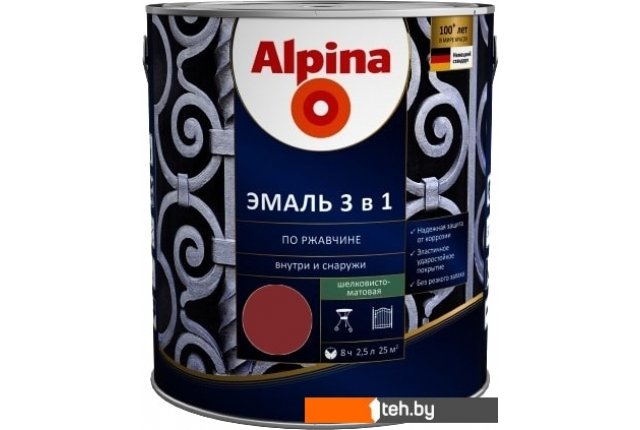 Фотографии, описание и технические характеристики модели Alpina Эмаль 3 в 1 по ржавчине (красно-корич., шелковисто-мат., 2.5 л) взяты из открытых источников, официального сайта производителя или представительства Alpina в Республике Беларусь.