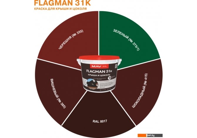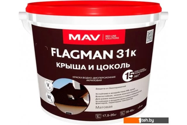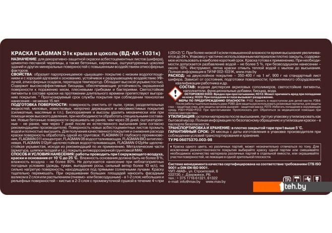 | Информация | Цвет товара может незначительно отличаться от предоставленного, так как монитор (экран) воспроизводит реальные цвета в силу его технических параметров.; Для декоративно-защитной окраски асбестоцементных листов (шифера), цементно-песчаной черепицы, а также бетонных, кирпичных, оштукатуренных цоколей зданий и других минеральных поверхностей с повышенным воздействием атмосферных факторов. Образует паропроницаемое «дышащее» покрытие с низким водопоглощением и с хорошей адгезией к основанию, устойчивое к разрушающему воздействию УФ-лучей, атмосферных осадков, перепадов температур. Обладает высокой укрывистостью. Содержит высокоэффективные биоциды, обеспечивающие устойчивость окрашенной поверхности к поражению мхом, плесневыми грибками и бактериями. Светостойкие пигменты в составе краски на протяжении длительного времени препятствуют выгоранию покрытия. Прогнозируемый срок службы покрытия при соблюдении технологии нанесения — не менее 15 лет. При окрашивании больших площадей наносить фасадным валиком в 2 слоя или распылением (пневмо- или безвоздушным) — в 1–2 слоя; небольших и рельефных поверхностей — кистью в 2–3 слоя. |