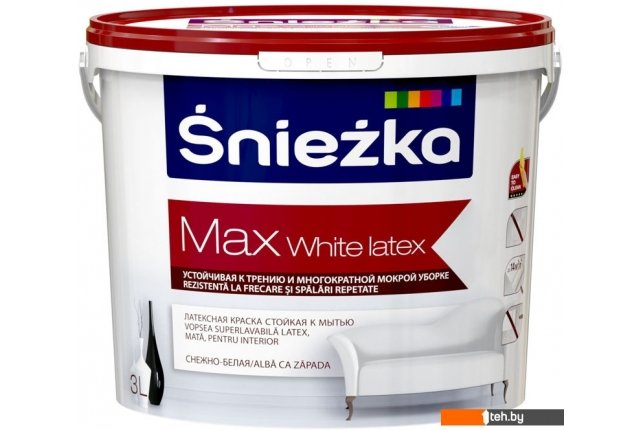 Фотографии, описание и технические характеристики модели Sniezka Max White Latex 3 л (белый) взяты из открытых источников, официального сайта производителя или представительства Sniezka в Республике Беларусь.