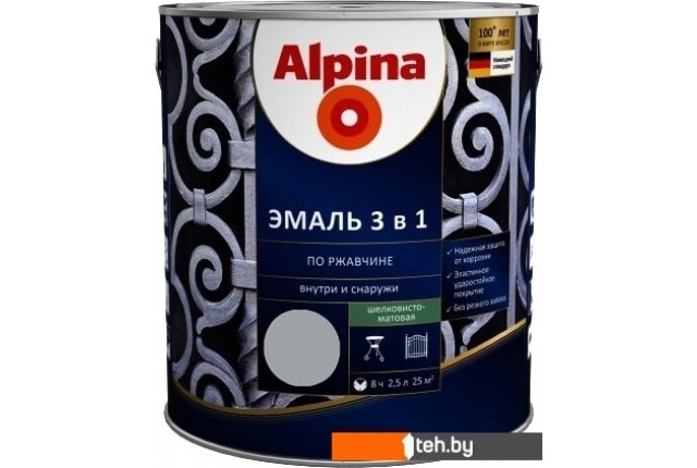 Фотографии, описание и технические характеристики модели Alpina По ржавчине 3 в 1 RAL7040 2.5 л (шелковисто-матовый серый) взяты из открытых источников, официального сайта производителя или представительства Alpina в Республике Беларусь.