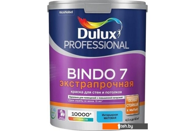 Фотографии, описание и технические характеристики модели Dulux Prof Bindo 7 для стен и потолков BW 4.5 л (матовый белый) взяты из открытых источников, официального сайта производителя или представительства Dulux в Республике Беларусь.