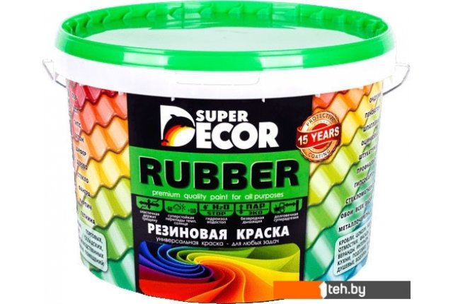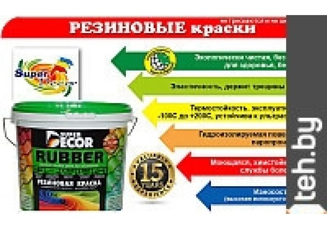 | Информация | Резиновая краска для самых суровых условий. Преимущества:эластичная — держит любую трещину и удары, не трескается и не шелушится при высоких температурах; водоотталкивающая — является надежным барьером для защиты поверхности от влаги (при покраске бассейна, фундамента или гидроизоляции); долговечная; дышащая — паропроницаемая пленка позволяет поверхности дышать, а значит можно не беспокоится об антигрибковой защите; экологичная — не выделяет в атмосферу никаких вредных химических компонентов, 100% экологически чистая. Резиновая краска Super Decor Rubber - это высококачественная краска премиум класса, изготовленная на финском латексе с добавлением итальянских пигментов. Инновационный продукт красящий любые поверхности. |