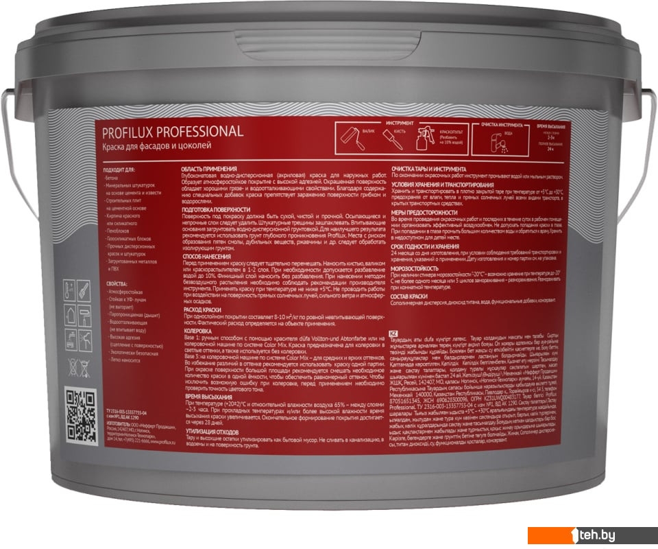Информация | Назначение. Глубокоматовая водно-дисперсионная (акриловая) краска для наружных работ. Адгезионные свойства позволяют применять данную краску по разным видам оснований, включая зону цоколя фасадов зданий. Пригодна для бетона, штукатурок на основе цемента и извести, строительных плит на цементной основе, кирпича красного или силикатного, пеноблоков газосиликатных блоков, прочных дисперсионных красок и штукатурок, загрунтованных металлов и ПВХ. Свойства. Покрытие обладает высокой стойкостью к атмосферным воздействиям, является высокопаропроницаемым, водоотталкивающим и экологически безопасным. Благодаря содержанию специальных добавок краска препятствует заражению поверхности грибком и водорослями. Свойства. Окрашиваемые поверхности должны быть прочными, чистыми, сухими, обладать несущей способностью и не содержать веществ, препятствующих адгезии. Основания с легкой осыпью или сильно впитывающие необходимо 1–2 раза предварительно прогрунтовать. Новые цементные и известково-цементные штукатурки обрабатывать не ранее, чем через 3 недели., температура поверхности, краски и воздуха должна быть не ниже 5°С и не выше +35°С, а относительная влажность воздуха не должна превышать 80%. Перед окраской очистите основание от пыли, грязи, жира, отслаивающихся частей старых покрытий, клеев или старых обоев. Неровности следует удалить механически и зашпаклевать. Ранее окрашенные глянцевые поверхности следует обработать шлифованием до матового состояния. ДСП, МДФ и ОСП- плиты, а также места с пятнами и разводами подлежат обработке блокирующим пятна грунтом. Перед нанесением краски загрунтуйте поверхность пригодной грунтовкой. |