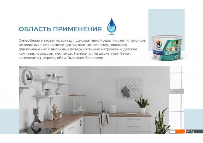 | Информация | Супербелая краска для декоративной отделки стен и потолков во влажных помещениях: кухнях, ванных комнатах, подвалах. Также рекомендуется для помещений с высокими поверхностными нагрузками: детские комнаты, коридоры, лестницы. Используется для образования высококачественных покрытий по штукатурке, бетону, кирпичной кладке, гипсокартону, волокнистоцементным плитам, дереву и обоям со структурированной поверхностью. Образует износоустойчивое, влагостойкое покрытие. Хорошо заполняет неровности, имеет высокие показатели адгезии и эластичности. Обладает повышенной укрывистостью. Легко наносится. При высыхании не образует полос. Пропускает воздух и воздушные пары «дышит». При многолетней эксплуатации не теряет первоначальных свойств. Свойства: для внутренних работ; идеальна для помещений с повышенной влажностью; покрытие выдерживает влажную уборку с применением моющих средств; морозостойкая. |