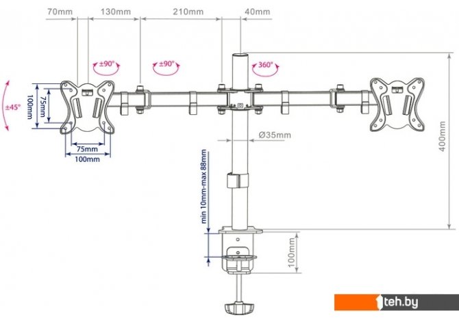 | Максимальная нагрузка | 16 кг (по 8 на каждый монитор) |