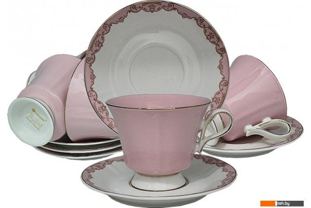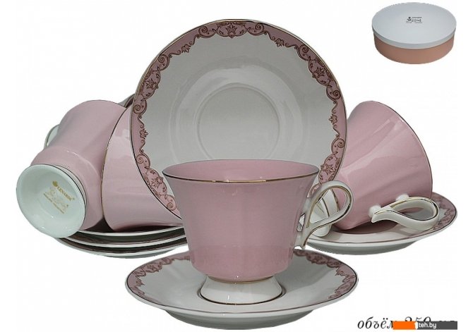 | Информация | - В наборе представлено 12 предметов. - Объем каждой чашки составляет 0.25 л. - Набор включает 6 чашек и 6 блюдец. - Изготовлен из качественного фарфора. - Ручки чашек также выполнены из фарфора. - Цветовая гамма: белый и розовый с золотистым кантом, украшенный рисунком. - Обратите внимание, что мытье в посудомоечной машине не рекомендуется. |