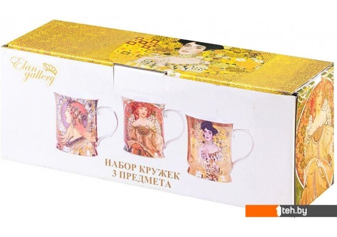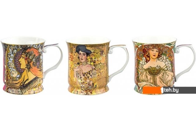 | Информация | Набор из трех кружек объемом 400 мл каждая с изображениями шедевров мировой живописи станет прекрасным подарком любой хозяйке. На кружках изображены работы кисти Альфонса Мухи и Густава Климта. Набор выполнен из высококачественного костяного фарфора New Bone China. Он изготавливается с использованием современных технологий и не уступает традиционному костяному фарфору в прозрачности, белизне и прочности, но при этом гораздо экологичнее в производстве. Кружки вместительные, с изящной формой и удобной ручкой. Не использовать в микроволновой печи и посудомоечной машине. |