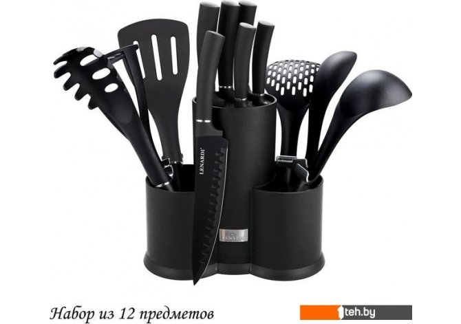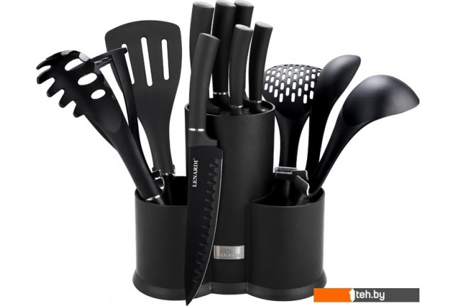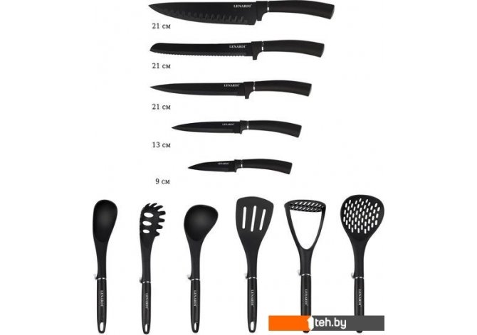 | Информация | Набор кухонных приборов: - половник; - шумовка; - ложка для спагетти; - подставка; - лопатка с прорезями; - картофелемялка; - ложка; - поварской нож (21 см); - нож для чистки овощей (9 см); - универсальный нож (13 см); - нож для хлеба (21 см); - шеф нож (21 см). |