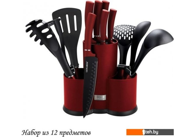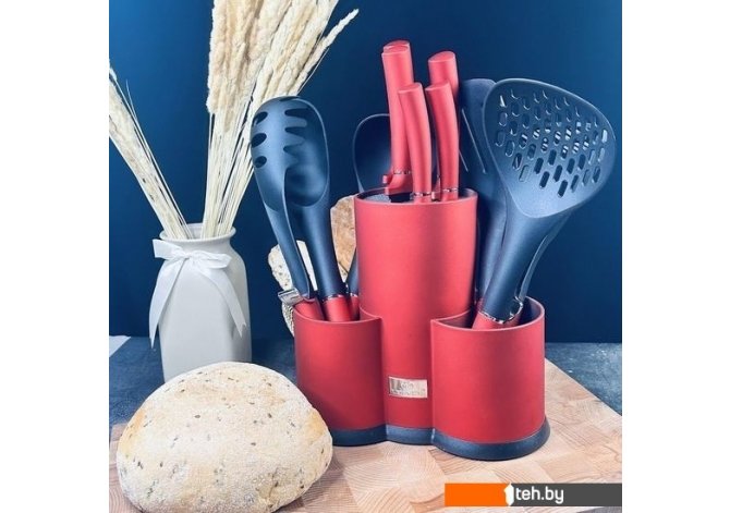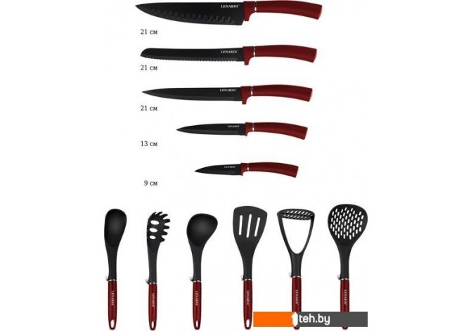 | Информация | Набор кухонных приборов: - половник; - шумовка; - ложка для спагетти; - подставка; - лопатка с прорезями; - картофелемялка; - ложка; - поварской нож (21 см); - нож для чистки овощей (9 см); - универсальный нож (13 см); - нож для хлеба (21 см); - шеф нож (21 см). |