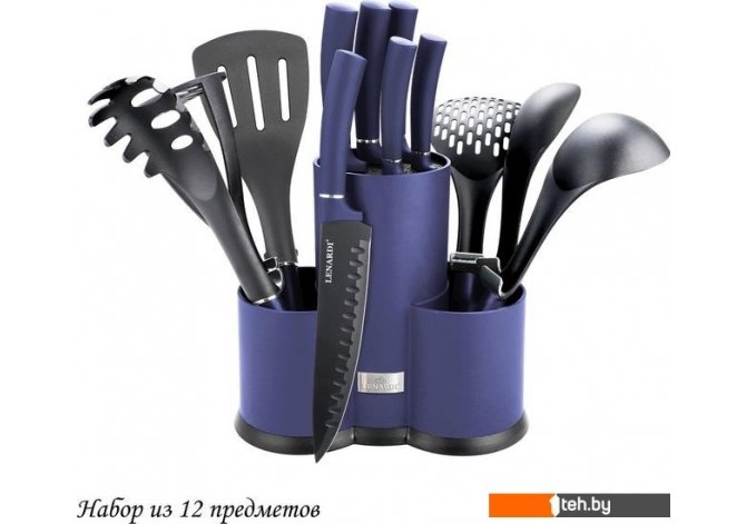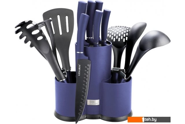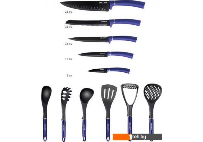 | Информация | Набор кухонных приборов: - половник; - шумовка; - ложка для спагетти; - подставка; - лопатка с прорезями; - картофелемялка; - ложка; - поварской нож (21 см); - нож для чистки овощей (9 см); - универсальный нож (13 см); - нож для хлеба (21 см); - шеф нож (21 см). |