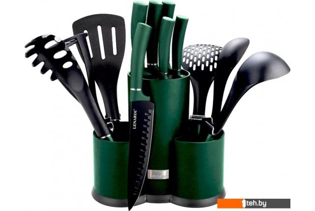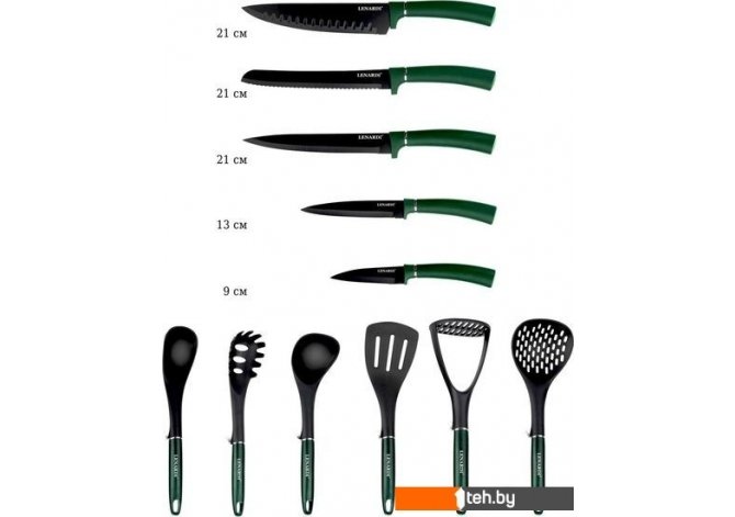 | Информация | Набор кухонных приборов: - половник; - шумовка; - ложка для спагетти; - подставка; - лопатка с прорезями; - картофелемялка; - ложка; - поварской нож (21 см); - нож для чистки овощей (9 см); - универсальный нож (13 см); - нож для хлеба (21 см); - шеф нож (21 см). |